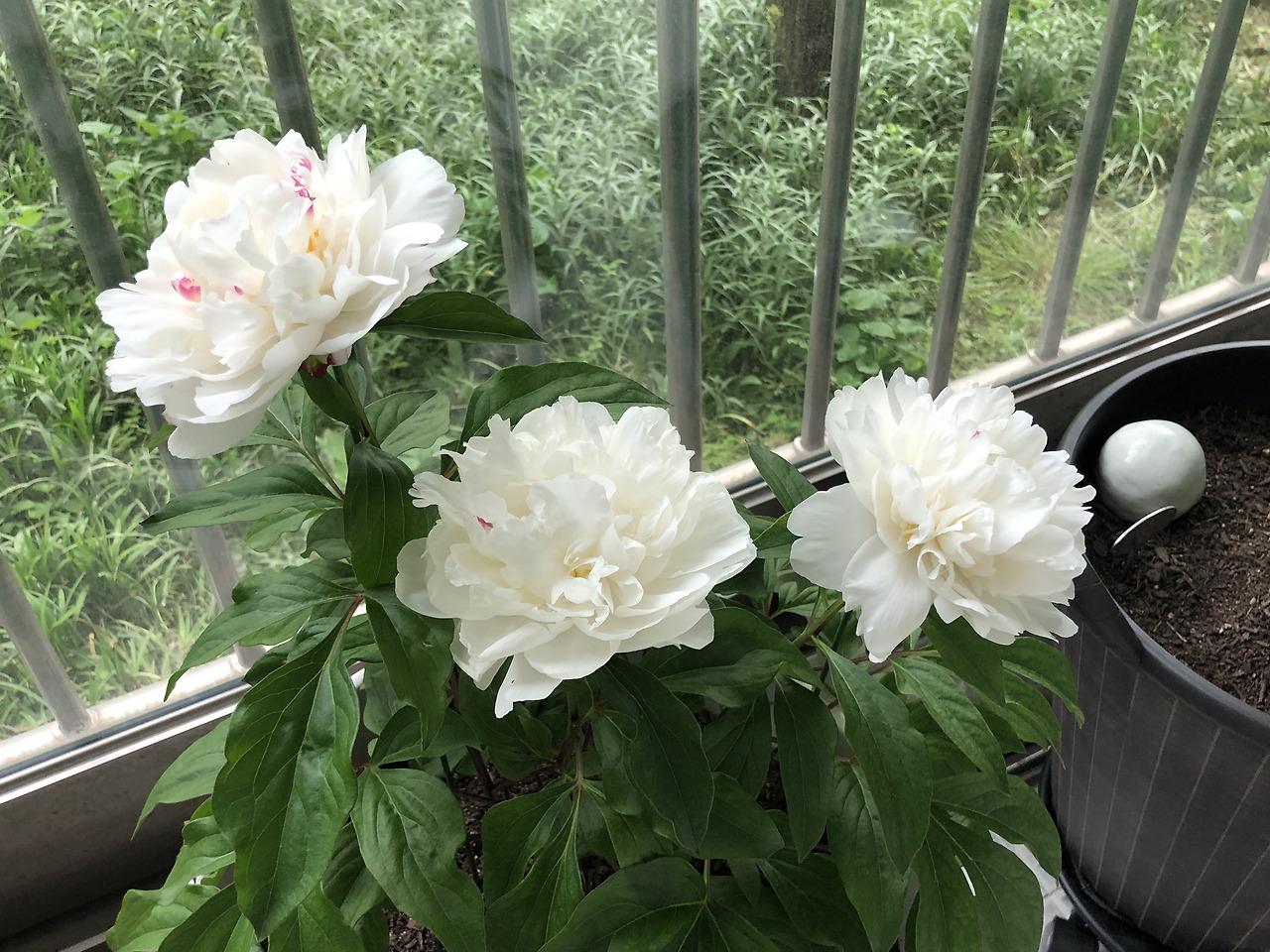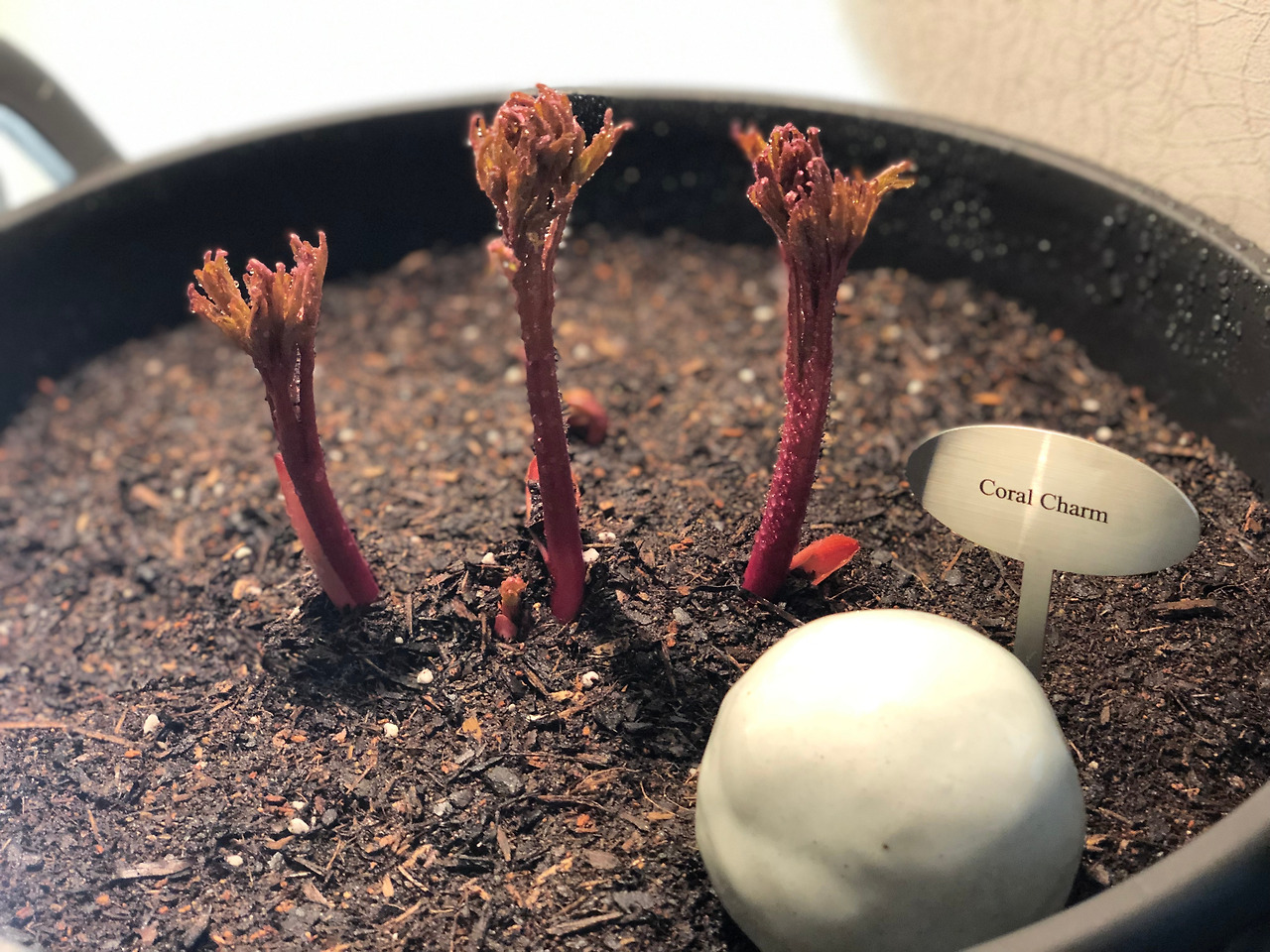 화이트 작약만으로는 뭔가 아쉬워 꽃시장에서 자주 샀던 코랄참을 하나 더 주문했다. 세 개의 핑크빛 촉에서 싹이 이미 올라온 예쁜 아이였다. 두 개의 화분도 이미 사이즈가 어마어마해서 엔젤칙스 같은 연핑크빛 작약도 하나 더 사고 싶은 마음을 꾹꾹 눌렀다.