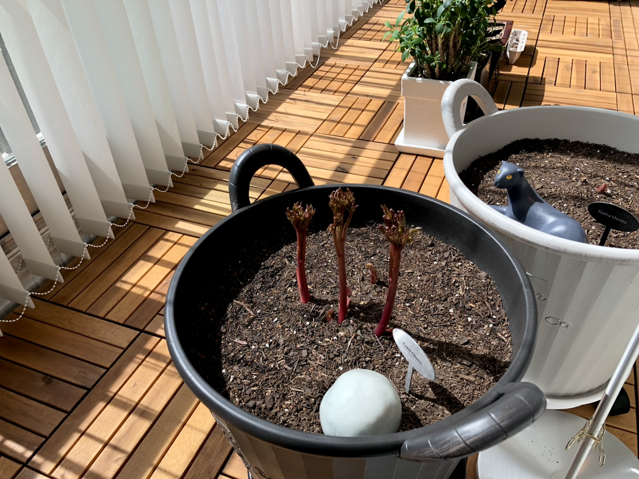 Spring brings new life to everything around us. Although I'm not experienced with peonies, I successfully grew Festiva Maxima peonies indoors last May. A flower seller suggested Coral Charm peonies would bloom beautifully this year, but I couldn't eliminate harmful insects like fungus gnats without pesticides because of my brother's pet. So, I decided to replant them in the public garden in front of my home. Now that spring has arrived, Coral Charm sprang up while Festiva Maxima still remains dormant. I hope to see both peonies bloom beautifully again this year./