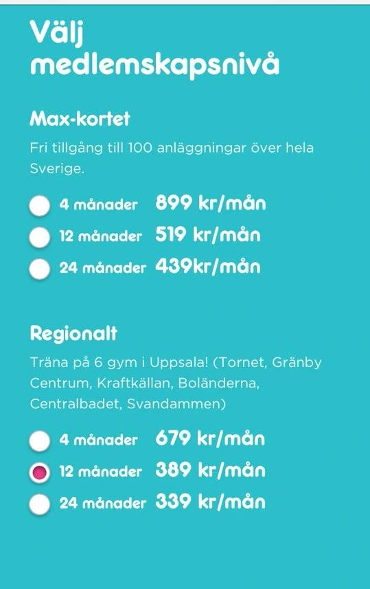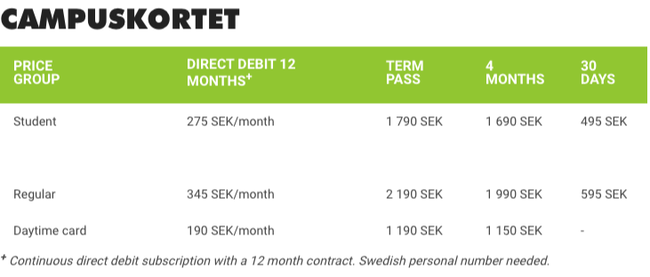 1개월 / 4개월 / 12개월 단위로 끊을 수 있으며 12개월 비용은 학생은 한 달에 389 SEK, 성인은 789 SEK를 내야 한다.