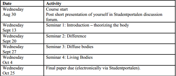 내가 들은 Gendered bodies는 젠더 스터디 및 페미니스트 리서치의 광범위한 이론들을 개략적으로 다뤘다. 그래서 '몸'과 관련된 젠더 개념, 젠더 구현, 젠더 이슈들, bodies 개념이 어떻게 자리 잡고, 변하는지에 대해 다뤘는데, 특히 보수적인 성 정체성을 유지하기 위해 bodies가 어떻게 성적으로 구현되는지 등에 대해 다뤘다. 수업 주제는 4개로 나뉘었는데, 한 주제 당 한 번의 Seminar가 진행되었다 (주제 파트에서 설명 예정)