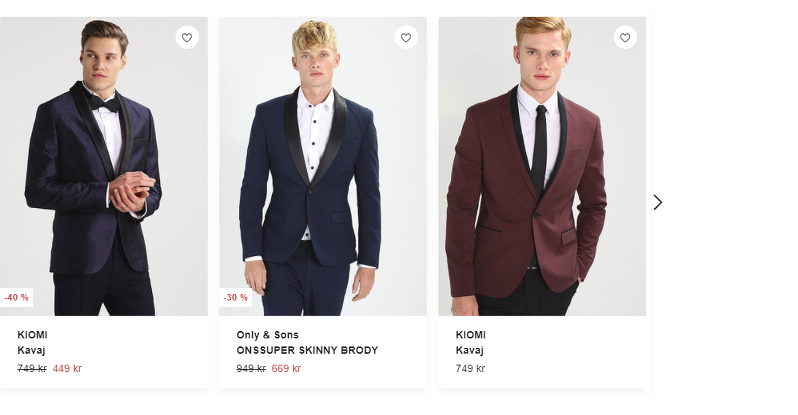 위의 두 사진이 kavaj 느낌이고 밑의 사진이 Högtidsdräkt 느낌인데 남자가 흰 보타이만 매고 있다면 완벽하다 (출처: https://www.zalando.se). 이 사이트는 정말 다양한 물건을 파는데 나도 여기서 내 가스크 드레스를 구입했다 (내가 갔던 가스크는 kavaj 였다).