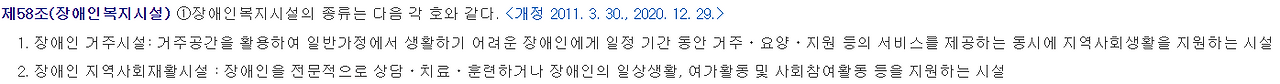 사실 "법"에서는 "장애인 지역사회재활시설"이 무엇인지에 대한 정의만 내리고 있고요, 여기에 해당하는 시설 종류가 무엇인지를 알아보기 위해서는 "장애인복지법 시행규칙 별표 4"를 찾아봐야 한답니다.