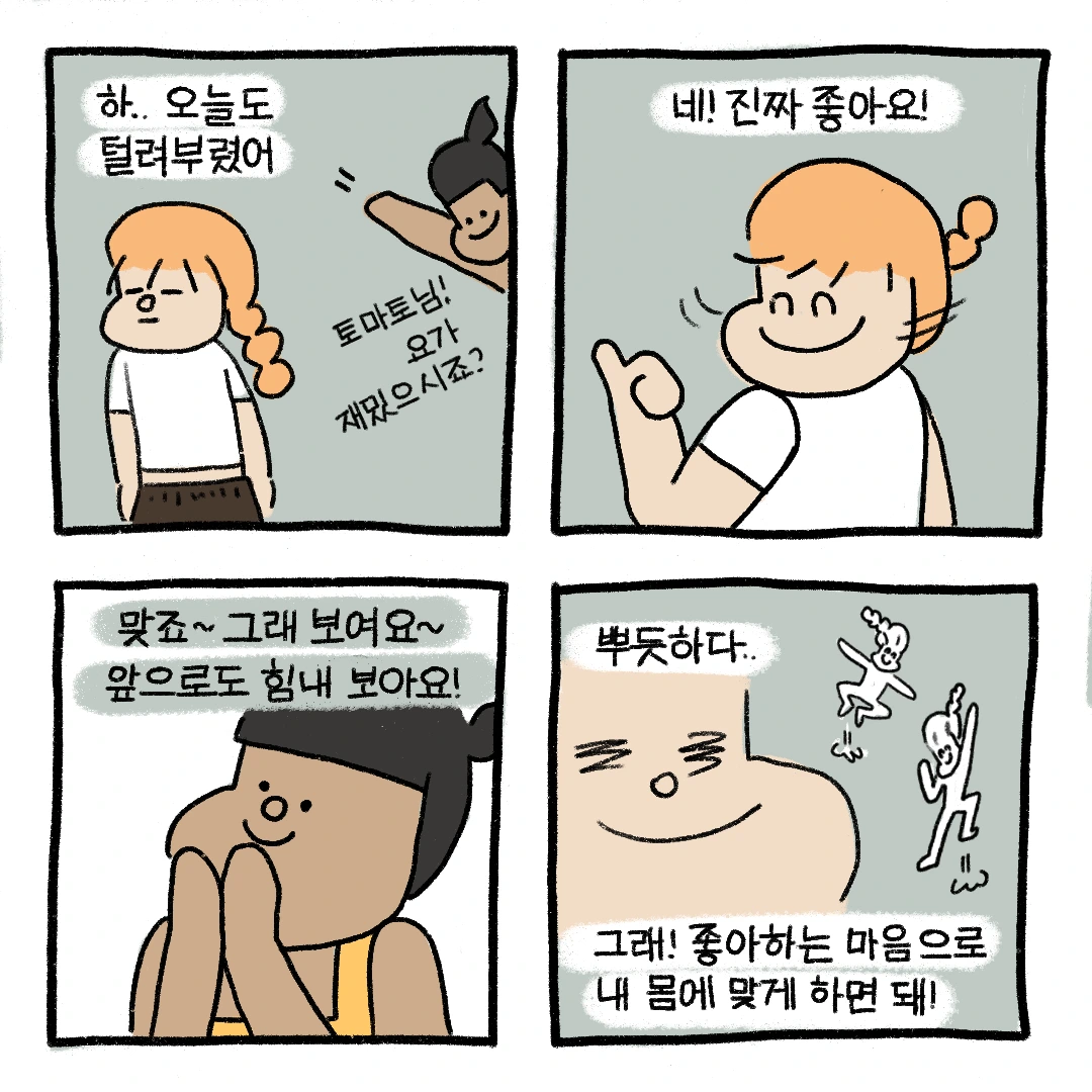 안녕 요기니? 혹시 요가를 시작한 지 얼마 안 되었을 때를 기억해? 온몸에 근육통을 달고 살잖아. 그렇지 않니? 나는 욕심이 과해서 나 스스로의 상태를 망각하고 더 깊은 요가에 빠져들곤 해. 그래서 문제야 문제. 한 번 다치면 다음 수업에 지장이 있다 못해 자괴감이 들기까지 해…. 다치지 않고 오래도록 요가를 하려면 욕심은 잠시 내려두어야 한다는 것을 느끼곤 요즘에는 내 몸의 상황에 맞게 적절한 요가를 이어가고 있어.