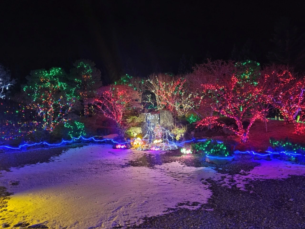 저녁에는 사람들이 정성 들여 만든 일본식 정원에서 화려한 *윈터라이트페스티벌*을 구경했습니다.