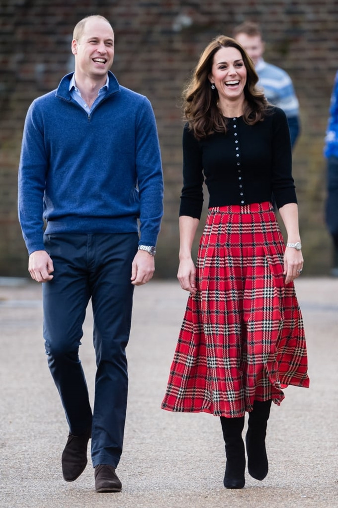 영국 왕세손비 케이트 미들턴은 격자무늬 플리츠 프레이드 스커트와 블랙 크롭트 카디건, 스웨이드 부츠로 고급스러운 블랙 앤 레드 룩을 완성, 올 연말을 위한 완벽한 코디를 제안했다.