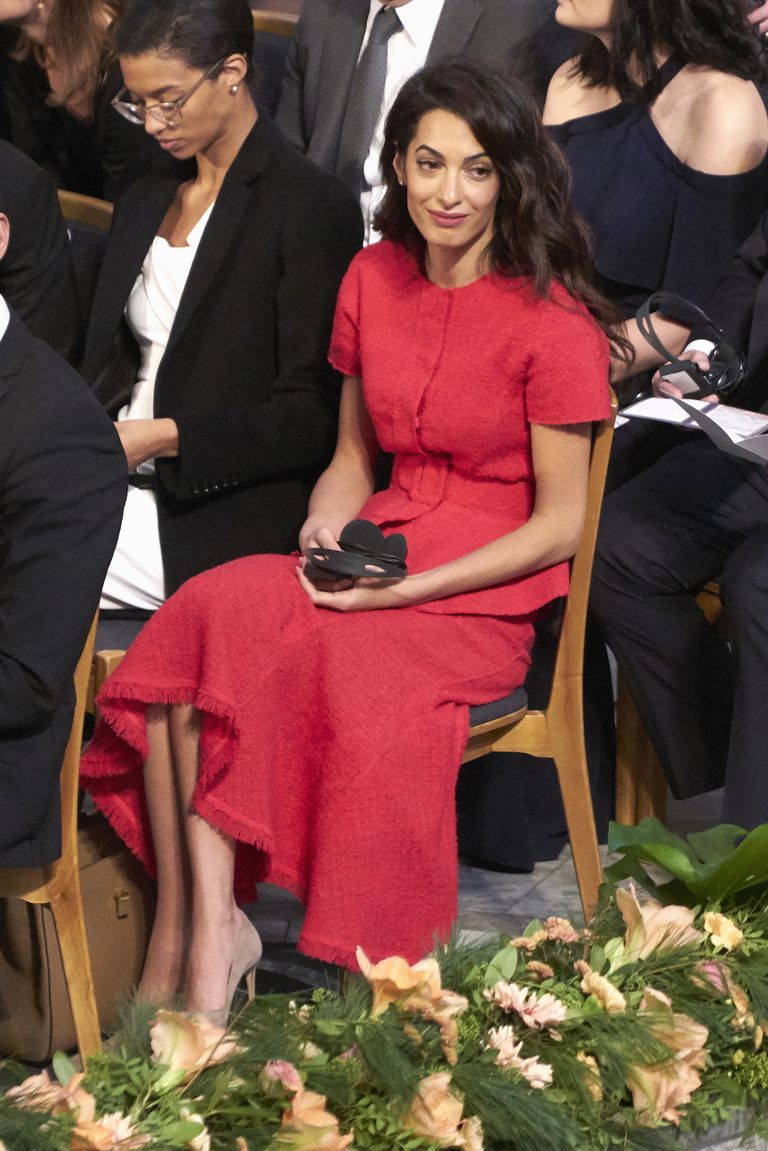 아말 클루니는 노르웨이 오슬로 시청에서 열린 2018 노벨 평화상 시상식에 참석해 '워너비 오피스룩의 대가' 다운 연말룩을 선보였다. 차분하면서도 멋스러운 레드 트위드 투피스룩을 착용했으며 허리에 벨트를 둘러 여성스러우 실루엣을 드러냈다.
