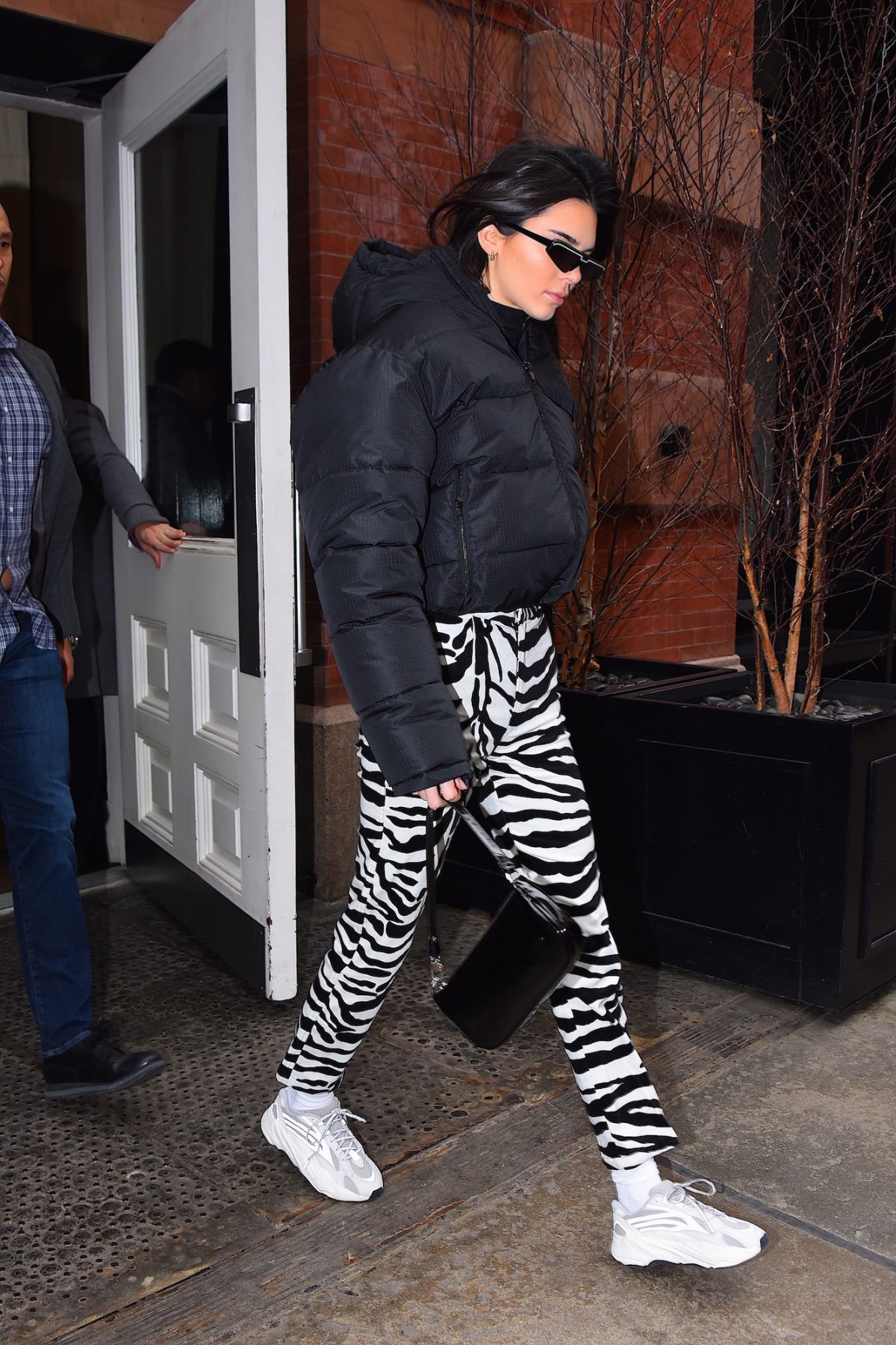 켄달 제너는 벨벳 소재감과 지브라 프린트가 환상적으로 어우러진 팬츠에 블랙 푸퍼 재킷을 매치하며 캐주얼 앙상블을 완성했다.