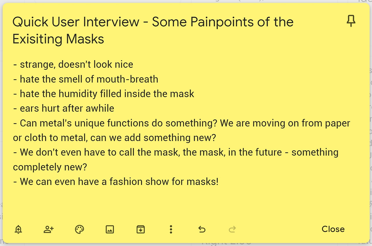 비록 공식적으로 프로그램에 포함된 것도 아니고 시간도 부족해 정식적으로 하지는 못 했지만, 주위 사람들에게 즉석에서 인터뷰를 하기도 했다. 마스크 착용 시 느껴지는 숨결이 싫다는 점이나, 오랜 시간 착용하고 있으면 귀가 아프다는 점, 보기 흉하다는 점 등의 많은 인사이트를 얻어낼 수 있었다. 교수님 역시 ‘마스크를 꼭 마스크라고 불러야 하는가’, ‘마스크를 꼭 귀에 걸어야 하는가’ 등 새로운 시각을 제공해 주셨다.