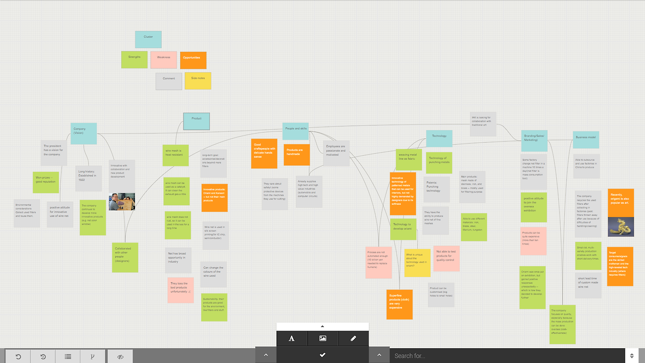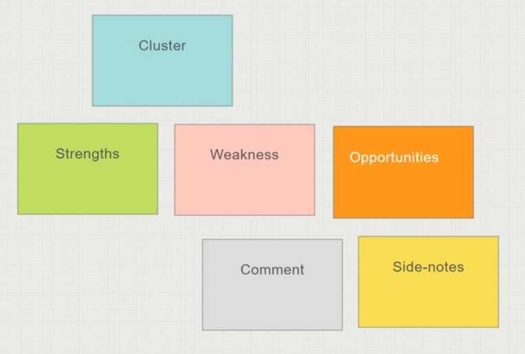 이 워크샵은 비교적 자율적으로 진행되었다. 우리 팀에서는 우선 현장 탐방에서 각자 받아 적었던 메모를 참고하며 회사의 특징들을 최대한 빠짐없이 적어보았다. 그렇게 모인 노트 그룹, 즉 cluster는 총 여섯 개로, Company (Vision), Product, People & Skill, Technology, Branding/Sales/Marketing, 그리고 Business Model이었고, 이들은 파란색 노트로 표현하기로 하였다. 그룹화시킨 이후에는 SWOT Analysis에서 착안해 Strengths (강점), Weaknesses (약점), 그리고 Opportunities (기회)로 나누어 노트를 다시 분류하였다. (기업 현장 탐방에서 얻을 수 있는 정보는 한정적이었기에 외부 위험요인인 Threats는 분류에 포함하지 않기로 하였다.) 분류가 다 끝난 뒤, 각 cluster마다 포괄적으로 아우를 수 있는 하나의 문장으로 요약하였고, 불필요하다고 판단된 cluster 하나를 제외해 총 다섯 개의 강점을 흰색 노트로 정리하였다.