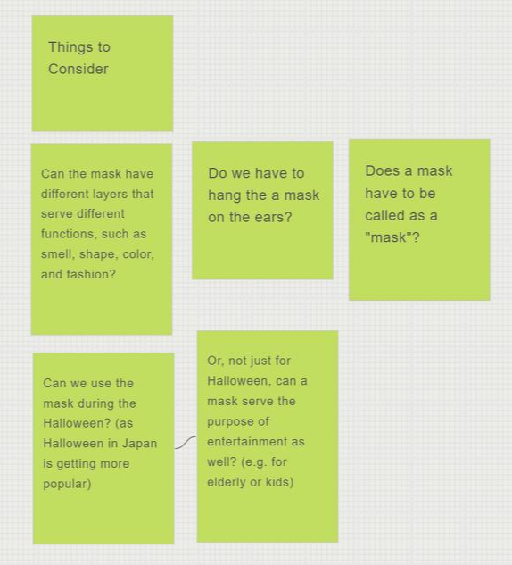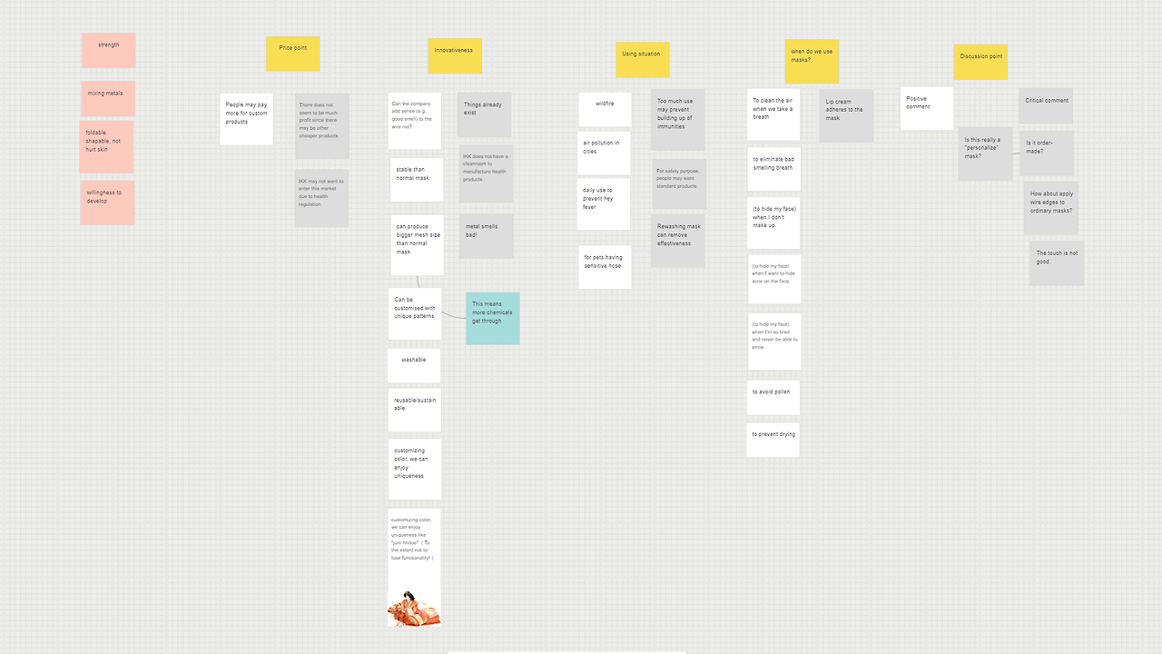 이어 탄력을 받은 우리 팀은 자율적으로 워크샵을 추가로 진행하였다. 필터링 마스크로 제품 아이디어를 결정한 뒤, 어떤 기능을 더할지, 누가 사용하면 좋을지, 언제, 또 어떤 목적으로 사람들이 마스크를 사용할지 등의 제품의 다양한 조건들을 구체화해본 시간이었다.