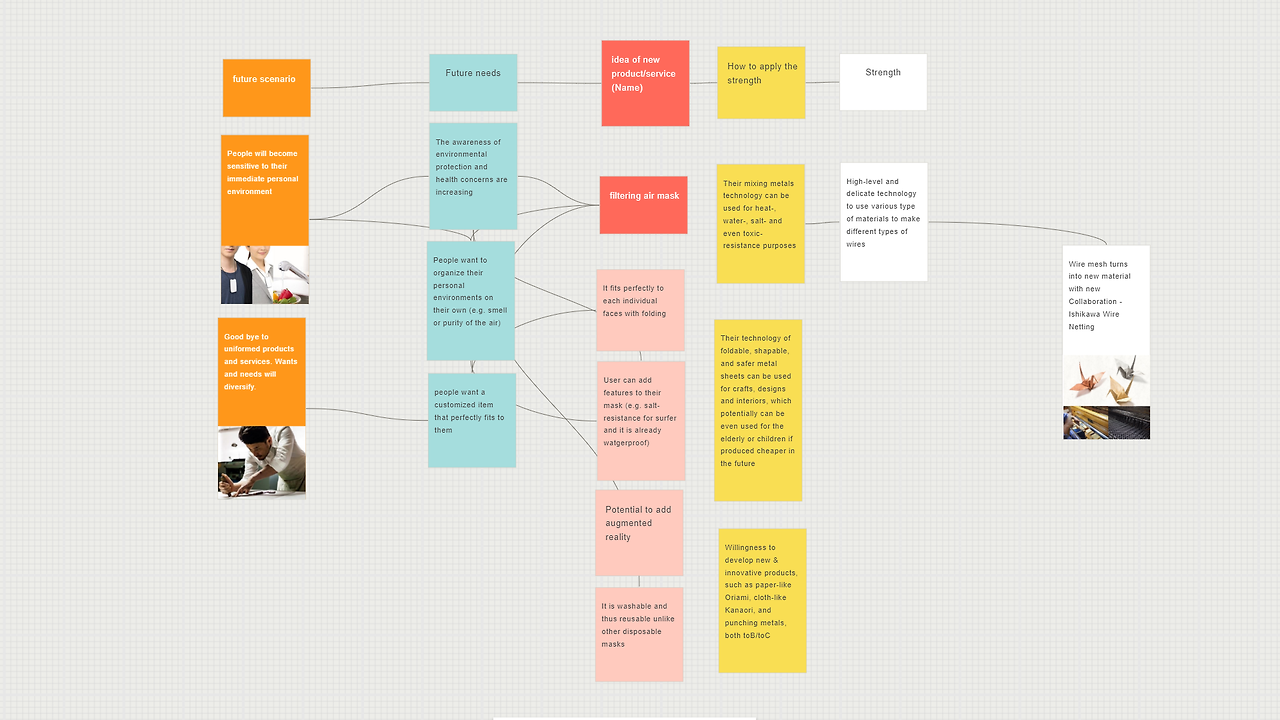 나는 세 가지 미래 니즈, 즉 개인 환경에 대한 민감성 (sensitivity to personal environment), 개인 맞춤성 (customizability), 그리고 환경 친화성 (sustainability)에 초점을 두었다. 회사의 강점 중 철망은 주로 필터링 목적으로 사용된다는 점과 Oriami와 Kanaami 같은 경우에는 철망을 자유자재로 구부릴 수 있어 장신구로도 활용할 수 있다는 점에 집중해 가능한 많은 아이디어를 내보고자 하였다.