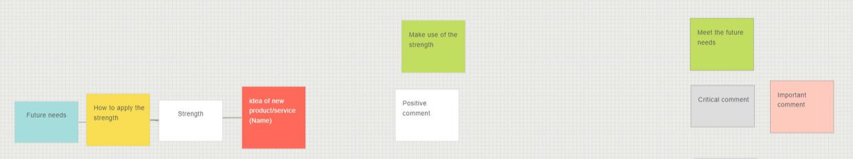 이 워크샵에서의 평가 기준은 우리의 주목적인 ‘회사 강점을 잘 활용하는가 (Make use of the strength)’와 ‘미래 니즈에 부합하는가 (Meet the future needs)’였다. 이를 바탕으로 좌측 열에 아이디어를 늘어놓고, 평가 기준은 각각 우측 열에 배치해 서로 아이디어에 코멘트를 남겼다. 이후 코멘트의 긍정도와 중요도를 바탕으로 노트 색을 다시 바꾼 뒤 정리하여 아이디어를 추려내었다.