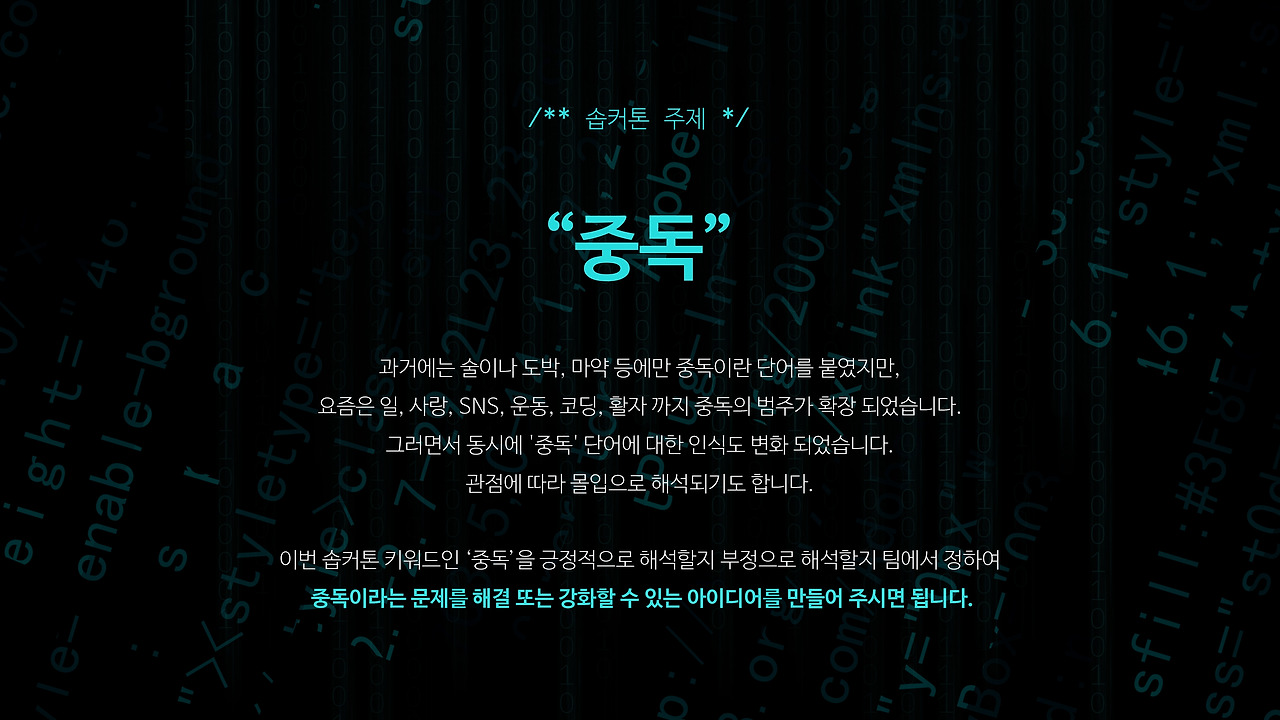 최종 발표까지 14시간 밖에 주어지지 않은 솝커톤에서 기획안에 확신을 갖기란 쉽지 않았다. 이번 솝커톤의 주제는 '중독'으로, 솝커톤 시작 직전에서야 주제가 공지되었는데, 긍정과 부정의 의미를 모두 고려해야 할 만큼 깊이 있는 고민이 필요했다. 어떤 방향과 주제를 바탕으로 '중독'이라는 키워드를 풀어낼 것인지, 또 그 주제를 어떠한 기능과 형태로 가져갈 것인지 — 기획자 뿐만 아니라 팀원들 사이에서도 많은 의견들이 오갔다.