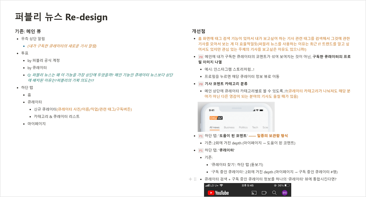 '개발 가능한 디자인'과 이를 '구현'하기를 연습해보는 데에 의의가 있는 프로젝트였음에도 불구하고, 현재 앱의 사용성 문제와 개선점을 비롯해 디자인의 우선순위를 설정하는 것으로 고민을 시작했다. 함께 프로젝트를 진행한 파트너 언니와 함께 퍼블리 뉴스의 기획자는 왜 이 기능을 추가했는지, 디자이너는 이 기능을 왜 이렇게 구성했는지 등을 고민했다. 앞서 얘기했듯 기본 배경지식 없이 UI를 구성하다 보니 깊이 있는 고민은 하지 못했지만, 그럼에도 각각의 기능과 레이아웃에 대한 'Why'를 끊임없이 물어보고 상기시킬 수 있어 굉장히 뜻깊은 시간이었다.