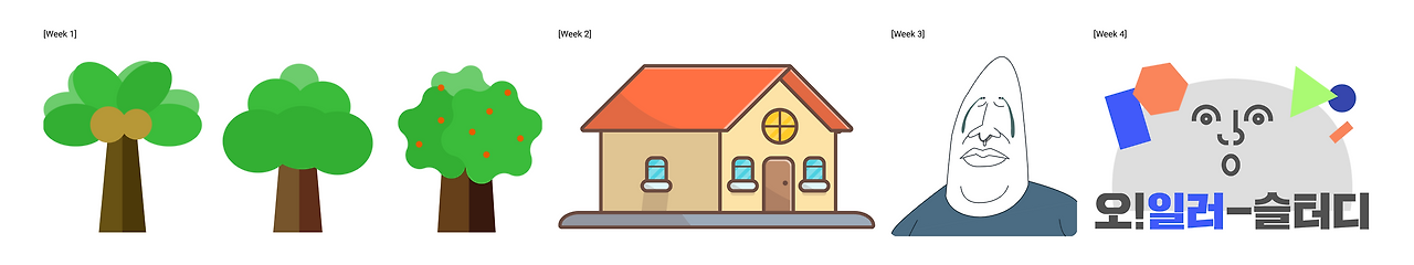 어렴풋이나마 감각을 익혔다면, 이를 직접 표현하고 만들어봐야 한다. 그동안은 포토샵 정도만 다루며 스스로 만족할만한 디자인을 만들어본 게 전부였다면, 이제는 더 넓은 스펙트럼의 디자인을 위해 툴도 능숙하게 다룰 줄 알고 싶었다. 한동안 사용하지 않았던 어도비 디자인 툴에 다시 익숙해지기 위해 동아리 내 '비전공자를 위한 일러스트레이터 스터디'에도 열심히 참여했다. 매주 하나씩 간단한 작업물을 만들어내며 잊고 있던 창작의 기쁨을 느낄 수 있었다.
