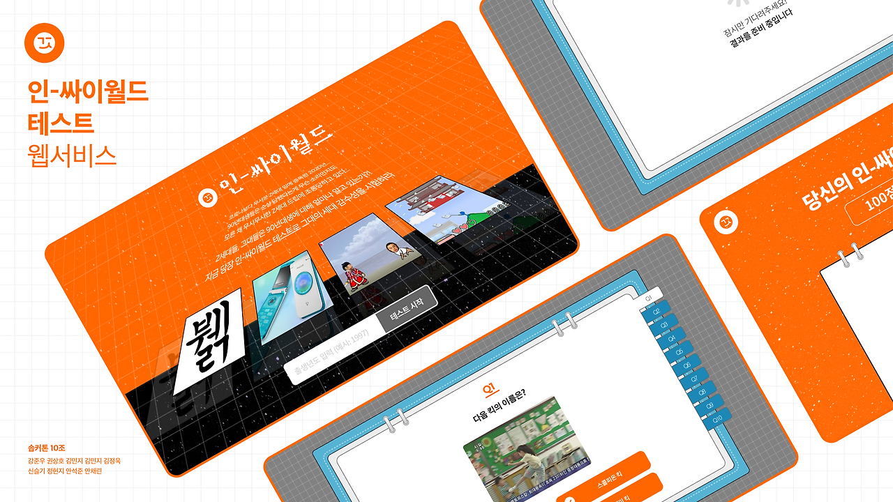 초기의 기획 아이디어와 비교해 많은 변화가 일어났지만, 기획 방향이 뚜렷해지니 디자인 컨셉과 뷰 구성 또한 금세 명확해졌다. '싸이월드'와 '밈', 그리고 'B급 감성'이라는 컨셉 방향에 맞추어 '썩소' 형태의 로고를 디자인했고, '테스트'라는 기능에 맞추어 디자인 레이아웃은 최대한 간단하고 직관적으로 구성했다. 그래픽 작업에는 포토샵과 일러스트레이터를 주로 사용했는데, 이때 함께한 디자이너 팀원으로부터 툴 사용이나 심미적인 요소와 관련해 많은 도움을 받았다.