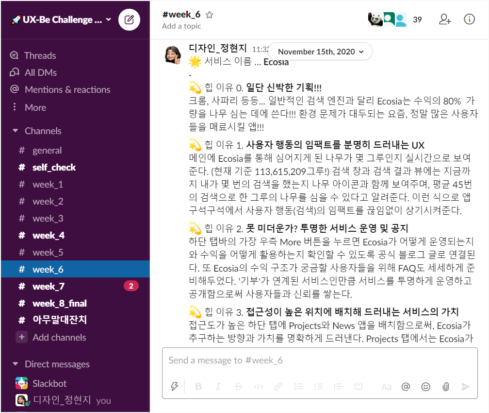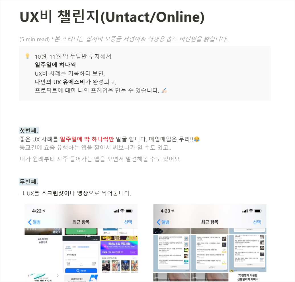 한편, 디자인 감각은 그저 강의를 본다고 얻을 수 아니다. 많이 보고 익혀야 한다. 디자인은, 특히 UX 디자인은 순수 창작물과 달리 주체가 '사용자'이기 때문이다. 다수의 사용자에게 가장 좋은 사용성을 제공하기 위해서는 이미 통용되고 있는 기능과 디자인 체계를 이해하고, 그러한 디자인이 어떻게, 그리고 왜 좋은 사용성을 제공하는지 설명할 수 있어야 한다. 이에 대한 훈련으로 힙한 서비스들의 비밀의 '힙서비 챌린지'를 모티브로 한 스터디, 'UX-Be Challenge'를 적극 활용했다. 틈틈이 앱/웹 서비스를 살펴보고 서비스를 분석해 글을 올리며 사용자 중심 사고방식과 디자인적 감각을 익히고자 하였다.