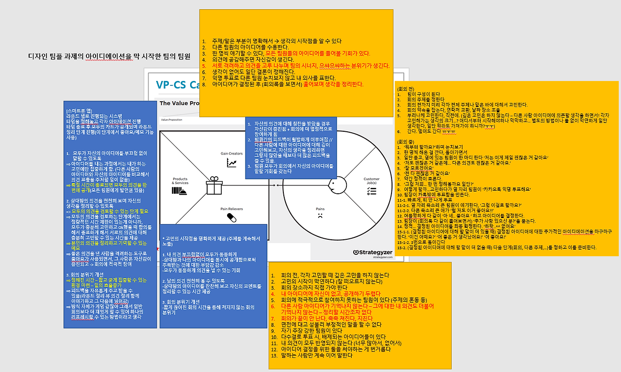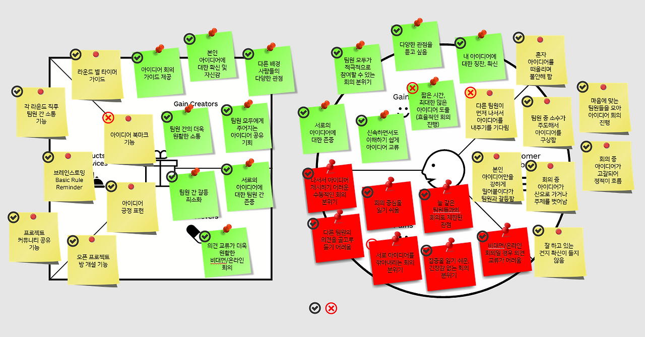 캔버스 우측의 고객 프로파일 맵의 고객 활동(Customer Jobs) 영역에는 아이디에이션 회의 상황을 세세하게 적어 내렸다. 회의 전과 회의 중을 바탕으로 해당 타겟 군에 속하는 잠재 고객은 어떤 활동 및 대화를 통해 어떤 경험을 하게 될지 번호를 매겨 정리했고, 이를 바탕으로 해당 타겟 고객이 어떤 불만이나 방해 요소를 느낄지(Pains)와 어떤 혜택이나 이점 등을 기대하거나 바랄지(Gains) 정리했다. 고객 프로파일 맵을 완성한 후에는 기존의 핵심 가치 및 기능을 비교하며, Pains 및 Gains에서 중요도가 높다고 판단되는 항목 세 개에 빨간색으로 표시해두었다.