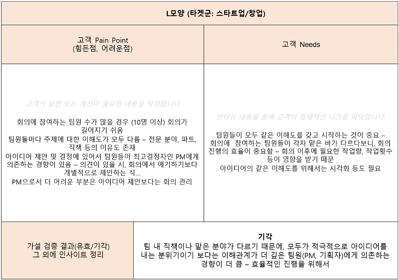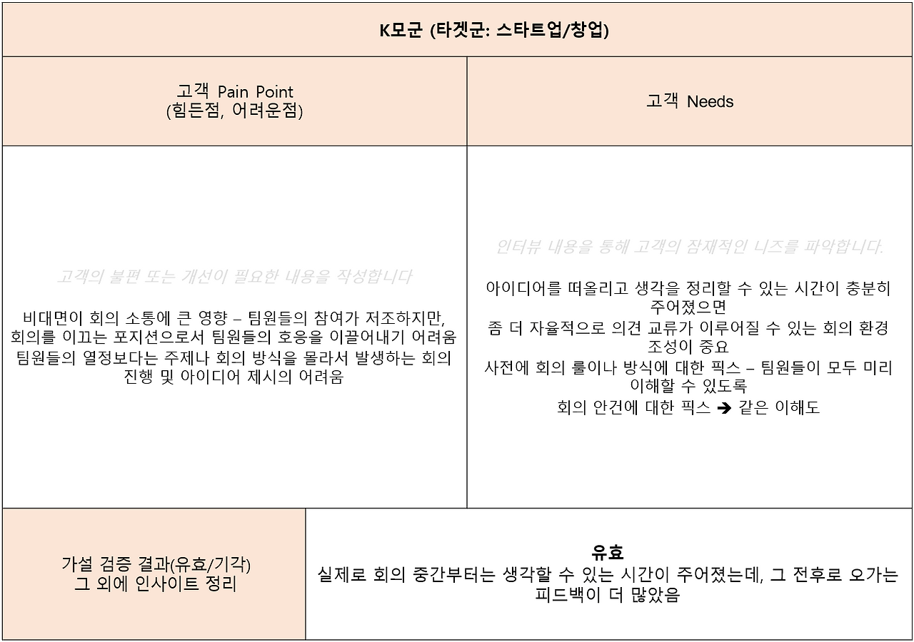 이에 '이익/매출'이라는 공동의 목표를 두고 적극적으로 회의에 참여해야 하는 '스타트업/창업' 타겟 군을 좀 더 집중적으로 인터뷰하게 되었다. 하지만 인터뷰 결과, 다양한 직책/업무/전문 분야에 종사하고 있는 팀원들이 모여 발생하는 '피드백 회피 현상'을 관찰할 수 있었다. 다른 분야에 대한 본인의 이해도가 낮음으로 인해 아이디어를 자유롭게 제안하기를 우려한다는 뜻이다. 또, 최대한 빠르게 이익을 창출해야 하는 수익성 목적을 띄는 타겟이다 보니, 아이디어의 다양성을 존중해 피드백을 무조건 많이 하는 것보다는 짧은 회의 시간 안에 효율적으로 유의미한 결론을 내는 것이 더 중요하다는 점을 파악할 수 있었다. 이를 통해, '스타트업/창업' 타겟 군에서도 상대방의 의견에 대해 충분히 검토하지 못해 피드백이 잘 이루어지지 않는 것이 아니라는 것이 밝혀져 가설 2단계는 기각되었다.