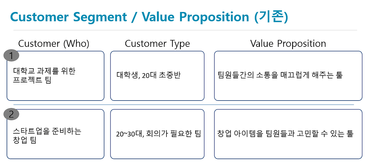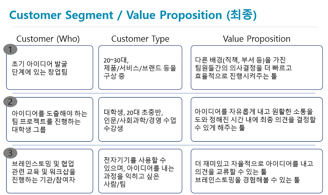 캔버스의 각각의 항목이 명료하니, 다음 단계인 타겟의 확장 역시 비교적 수월했다. '디자인 팀플 과제의 아이디에이션을 막 시작한 팀'이라는 타겟 군에서 비롯된 가치 제안 맵을 바탕으로, 중요도가 높다고 판단된 Pains 및 Gains를 또 어느 고객군이 겪을 법한지, 또 우리가 정의한 기능(Products & Services)이 어떤 사람들에게 유용할지 고민해보았다. 이를 바탕으로 타겟을 '학교 팀플 과제'를 위한 팀과 '스타트업 및 창업'을 위한 팀, 두 개의 군으로 분류해보았다.