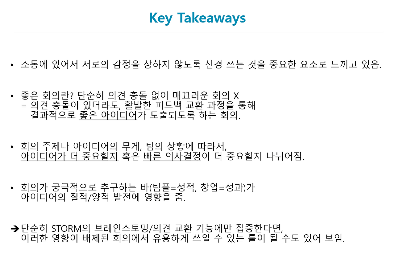 희망적인 점은, 준비한 가설이 각각의 타겟 군에서 기각된 이유가 명확하다는 것이다. '학교 팀플 과제' 팀에서는 '강제성'이라는 변수가 있었고, '스타트업/창업' 팀에서는 '효율성'이 더 우선시되었다. 그렇다면, STORM의 브레인스토밍 및 의견 교류 기능에만 집중한다면, '강제성'이나 '효율성' 등이 배제된 회의에서는 유용하게 쓰일 수 있을 것이라는 새로운 가설이 세워지게 된다. 이를 바탕으로 세 번째 잠재 타겟 군을 도출할 수 있었는데, 바로 '브레인스토밍 및 협업 관련 교육 및 워크샵을 진행하는 기관/참여자'이다.