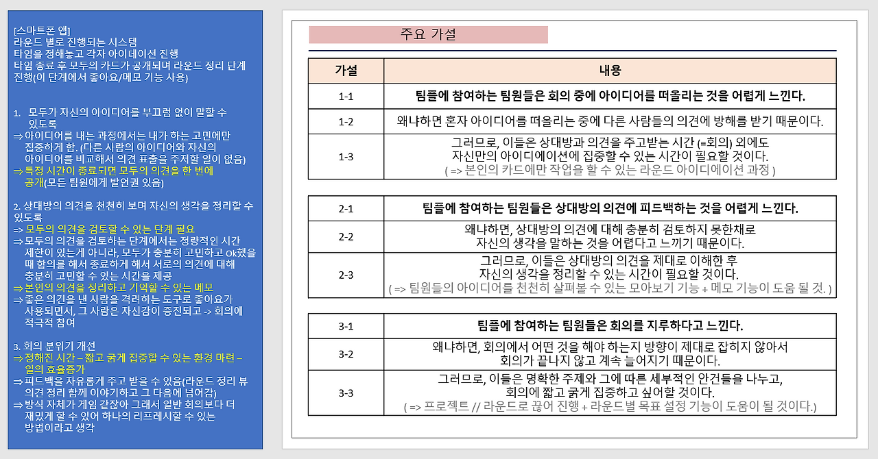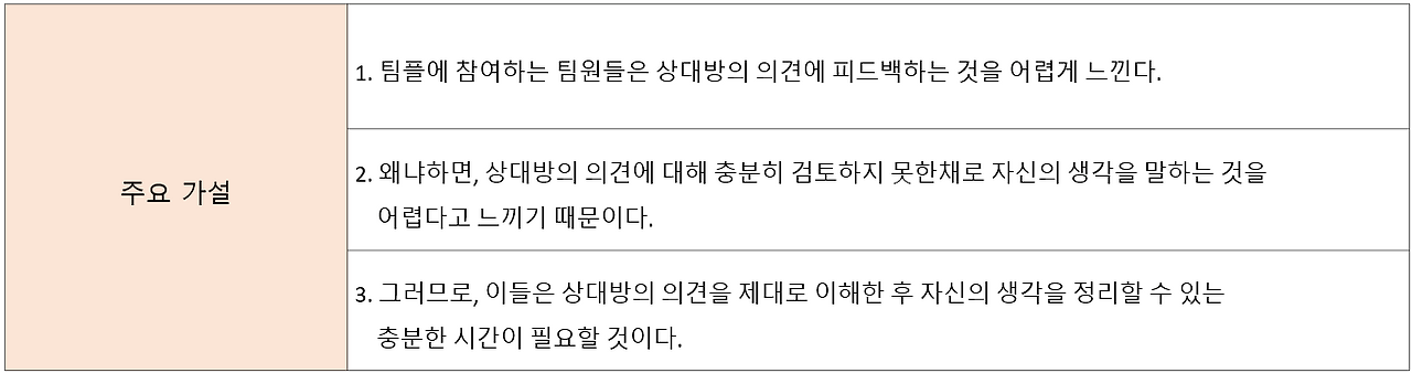 우선 주요 가설의 1단계인 '팀플에 참여하는 팀원들은 상대방의 의견에 피드백하는 것을 어렵게 느낀다'는 유효하다고 판단되었다. 인터뷰 결과, 다양한 이유로 인해 사람들은 다른 팀원들의 아이디어에 피드백을 제시하는 것을 어렵게 느낀다고 답하였기 때문이다.