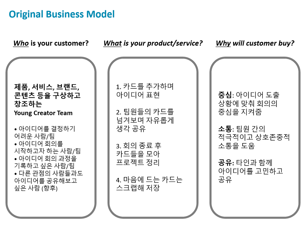 정리하자면 – 기획 초기에는 young creator team이라는 대분류 아래에 회의 상황을 기준으로 타겟을 나누었다. 아이디어 결정이 어려운 팀, 회의를 이제 막 시작한 팀 등 상황을 기준으로 하다 보니, 각 상황마다의 문제점을 가설로 정의하기가 꽤나 어려웠다. 이에 초기 기획안의 불씨였던 세 가지 문제의식인 '아이디어의 제한', '팀원 소통의 한계', '회의 방식의 비정형화'를 기정 사실화해둔 채 기능 발전에 집중했었다.