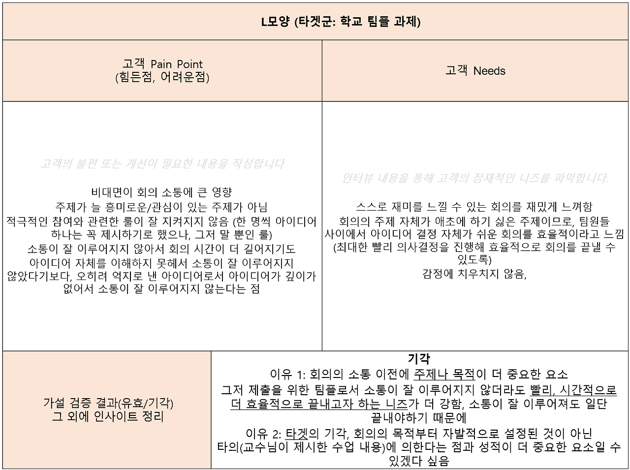 이러한 고민을 발판 삼아 문제의식을 도출했을 당시로 돌아가 타겟에 대한 가설을 다시 점검하는 시간을 가졌다.