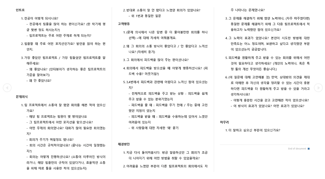 반면, 타겟의 유효성을 검증하기 위한 이번 인터뷰를 진행하기 위해서는 위와 같이 세부적인 인터뷰 질문지가 필요했다. 미리 가설을 '고객 요구 상황', '불편사항', '기대효과' 세 단계로 나누어 정리해둔 덕에 인터뷰 질문도 명료하게 세 단계로 나누어 준비할 수 있었다.