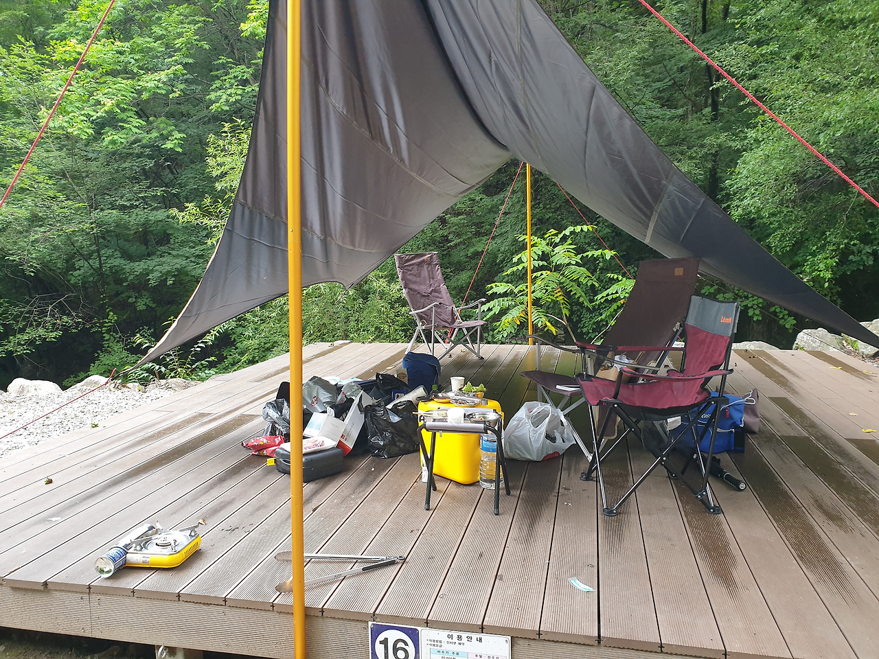 하이원에 가서 아이랑 워터파크도 가고 카지노도 구경시켜주겠다는(입장이 가능한지는 모르겠지만) 계획은 언제 종식될지 모르는 코로나 때문에 또 변경되었다. 워터파크도, 카지노도 들어갈 수 없는 하이원이라. 그럼 대체 뭐하지, 하다가 근처에 계곡이 많으니 당일치기 캠핑으로 고기 구워 먹고 오는 걸로 결정했다. 지난번 뙤약볕에서 고기 구워 먹는 고생을 한 후 남편은 타프(그늘막)도 질렀다.