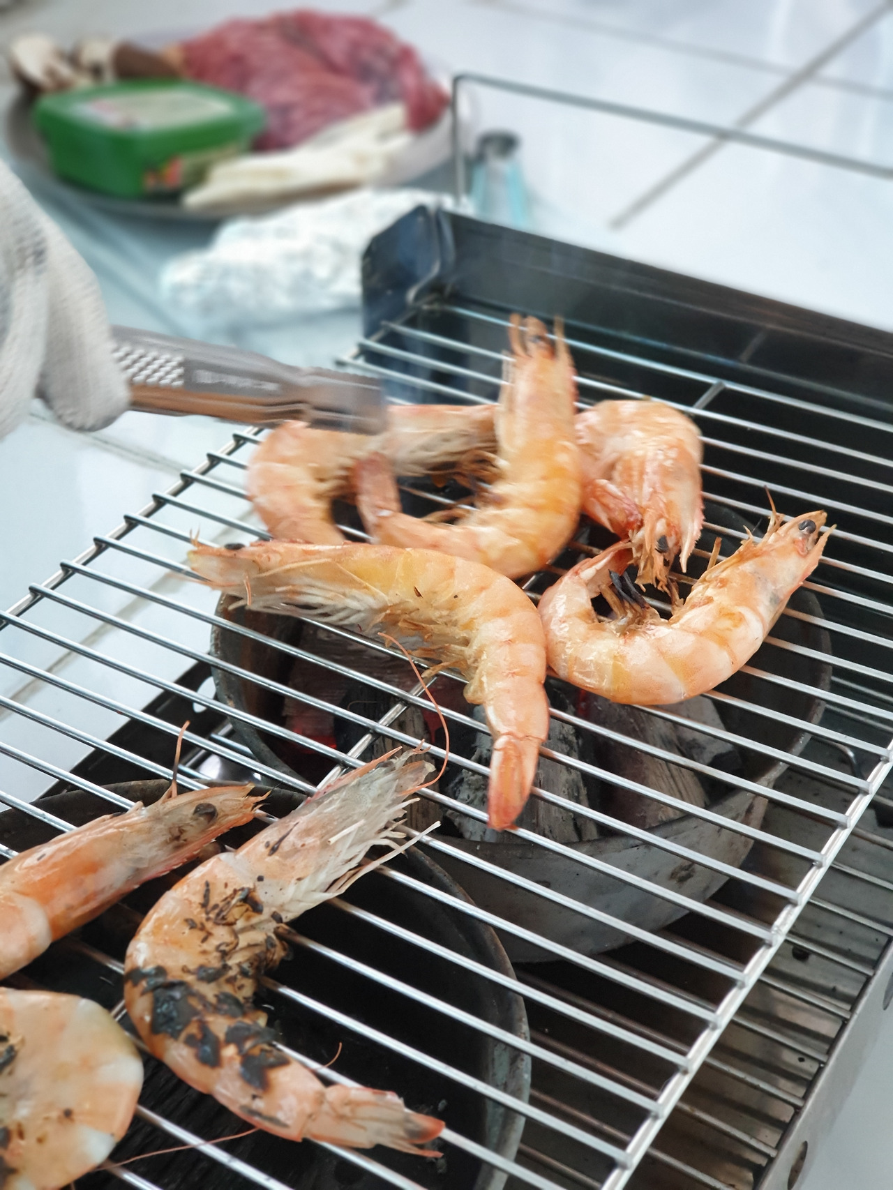 누구든지 그러하겠지만 이 사람도 한 번 꽂힌 것에는 말린다고 말려질 사람이 아니므로, 나름대로 최대한 연기가 적게 나도록 해달라 주문을 했다. 그러나 숯을 피워 본 사람들은 알 거다. 번개탄 없이 숯에 불을 피우기가 얼마나 어려운 것이며, 설령 숯에 불이 붙었다 하더라도 연기 없이 고기를 굽는 것이 또 얼마나 어려운 일인지를. 특히 새우나 고기에서 물, 기름 등이 떨어지면 불꽃이 일고 연기가 난다.