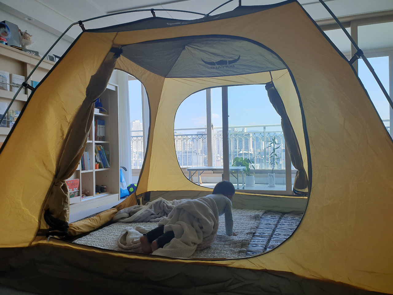 그 어느 때보다 빠른 실행력으로 거실에 텐트를 치니 이야, 그 어느 때보다 캠핑 분위기가 제대로다. 집 조명에 텐트 컬러가 아주 인테리어 소품처럼 딱 어울렸다.