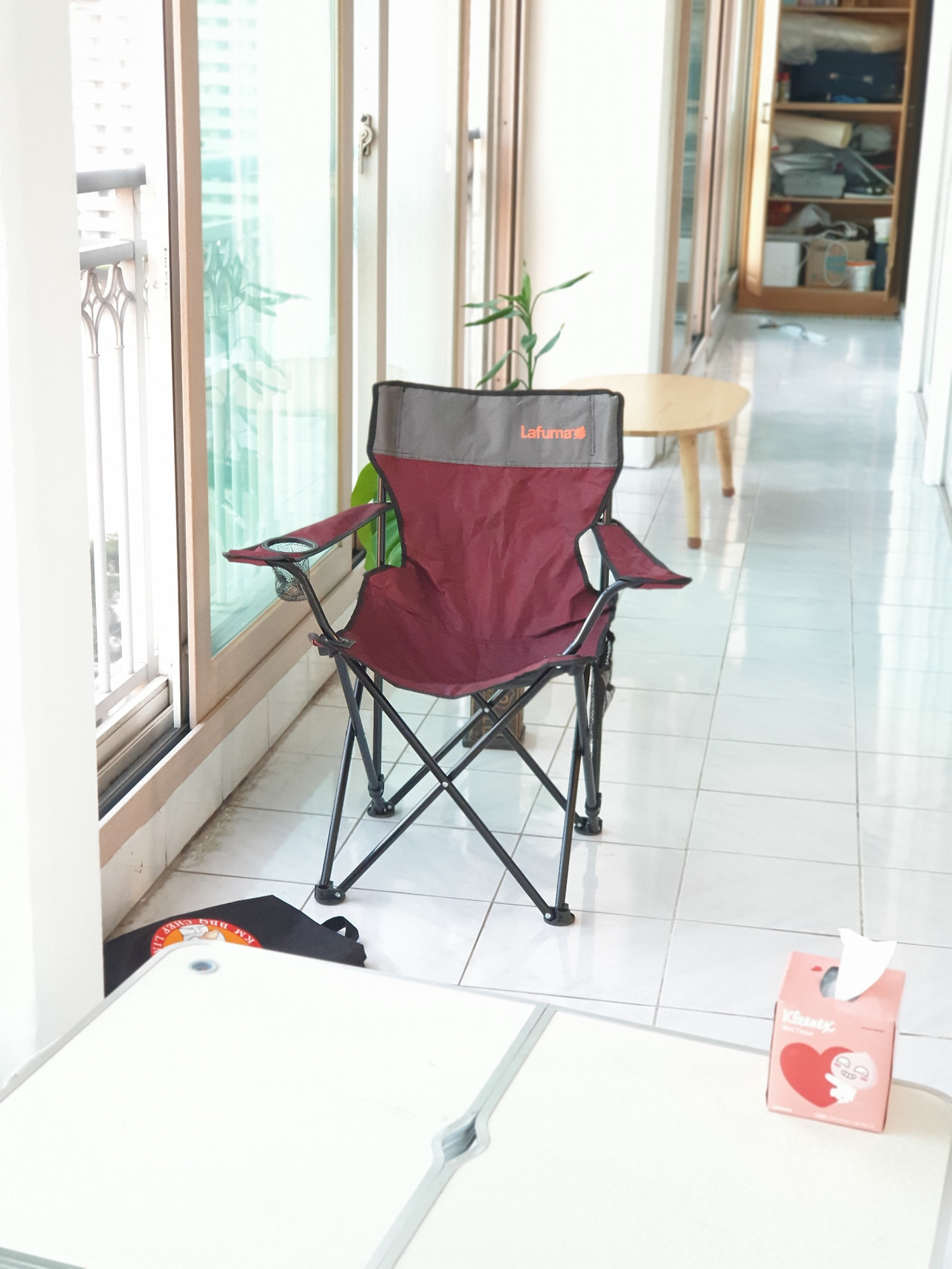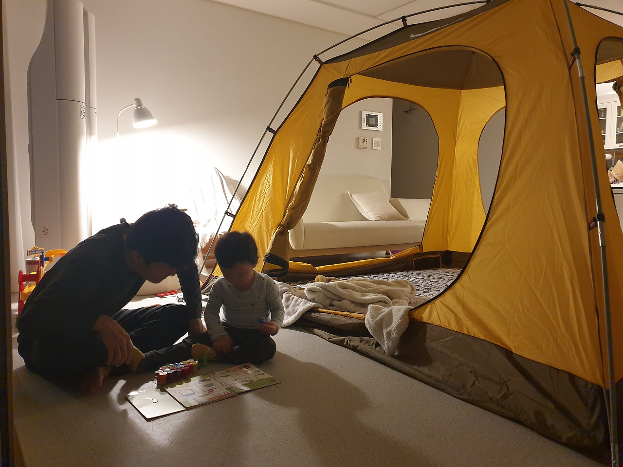 홈캠핑을 하니 가장 좋은 건, 어딘가로 짐을 바리바리 싸들고 가지 않아도 된다는 점이다. 올 때도 바리바리 싸들고 올 걱정이 없다. 그 외에도 좋은 점은 계속 있다. 창을 열어 바람을 조절하니 언제나 적당한 바람을 유지할 수 있다는 점, 방충망이 완벽하니 모기나 기타 벌레들이 없다는 점, 텐트 안 공기가 따뜻해서 그 어느 때보다 아늑하다는 점, 아이 장난감이 다 구비되어 있으니 혼자서도 적당히 잘 논다는 점, 필요한 것이 생기면 그때그때 바로 조달이 가능하는 점, 그리고 무엇보다 우리가 집 안에 있으므로 언제든 널브러져 잘 수 있다는 점. 눈 앞에 숲과 깨끗한 물, 맑은 공기가 없다는 점만 빼놓고 캠핑의 단점은 모두 보완한 것이 바로 홈캠핑이었다. 우리 같은 캠린이에겐 아주 딱이다.