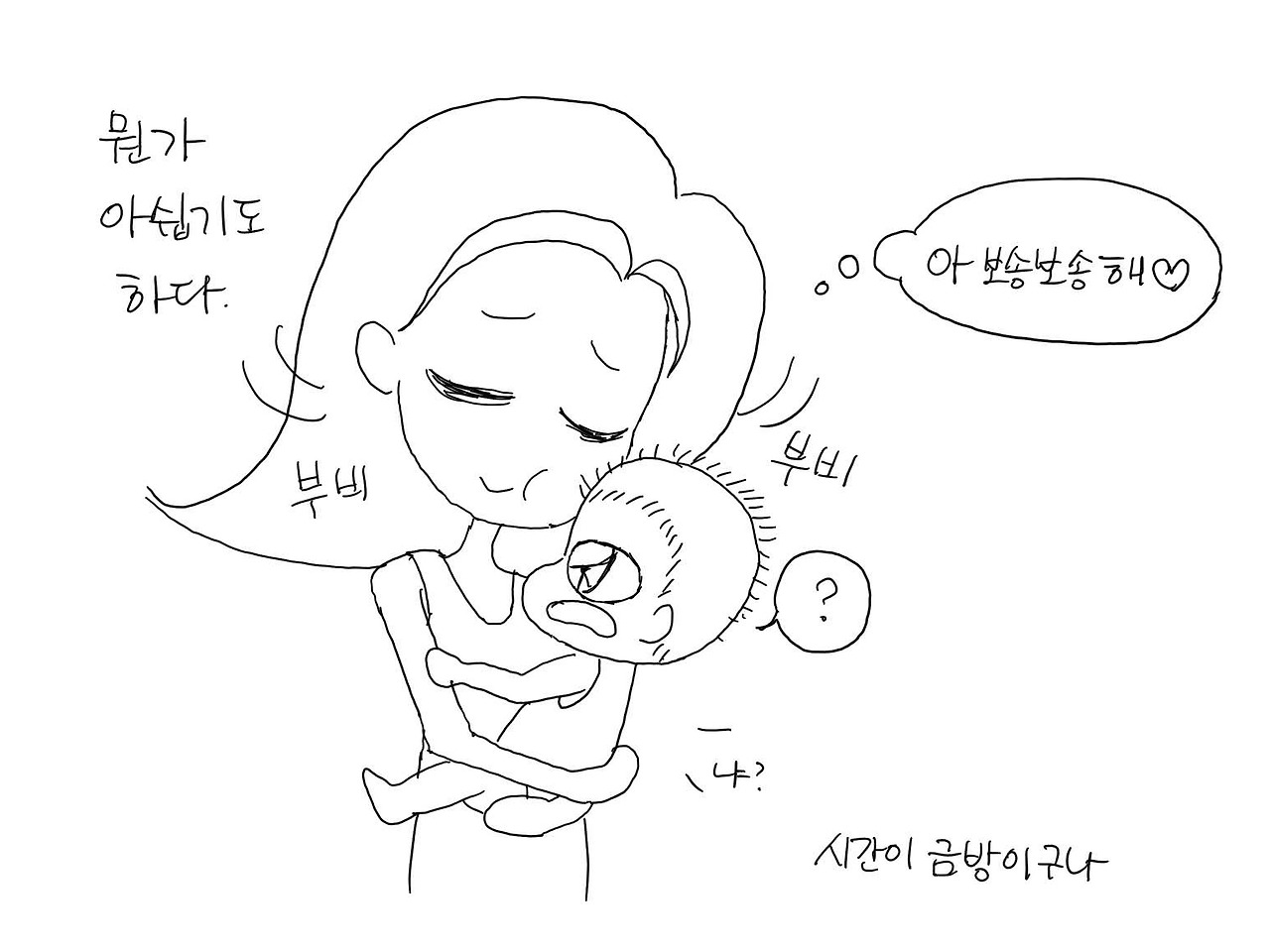 아기는 분명 내게 '관대함'이라는 미덕도 선물해줬다. 다른 아기들이 예뻐보이니 시끄러운 것도, 우는 것도 예전만큼 싫지 않다. 끊임없이 돌아다니면서 세상을 탐색하는 아기들의 끝없는 호기심과 왕성한 에너지가 이제야 보인다. 신나게 뛰어다니다 내 몸에 부딪히는 아이들한테 내던 신경질도 줄고, 실수로 힘껏 발을 밟아도 쉽게 용서가 된다. 30여년을 살면서도 갖추지 못한 미덕이 단 1년 새에 생기다니 장족의 발전이 아닐 수 없다. 아이를 낳아야 어른이 된다는 말은 아마 이런 면도 어느 정도 포함하지 않을까 싶다.