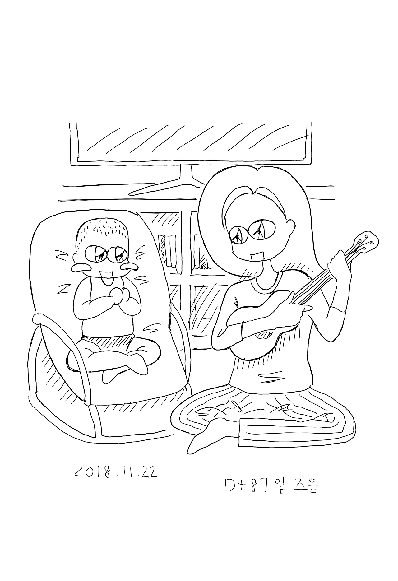 그런데 태어나고 나서도 한동안은 아기가 잘 보지도 못하고 잘 듣지도 못하고 오직 울기만 하기 때문에 알 수가 없었다. 한 번은 아기침대에 멀뚱멀뚱 누워있는 아기에게 우쿨렐레를 켜주었는데 별 반응이 없었다. 음, 우쿨렐레 태교가 별로 효과가 없었나? 그러다 아기가 엄마를 보고 웃기 시작하며 좋은 기분을 표현할 수 있을 무렵이 되자 반응이 달라졌다. 우쿨렐레를 켜며 노래를 해주면 너무 좋아서 소리까지 내며 웃는 것이었다. 게다가 제법 호불호가 생겨서 자신이 좋아하는 멜로디와 노래를 들으면 꺄르르 웃다가도 별로 좋아하지 않는 노래를 부르면 표정이 금새 뚱해졌다. 그러나 내가 연주할 수 있는 레퍼토리는 몇 개 없었기 때문에 아기를 위해서라도 다른 곡들을 열심히 찾아 연주해주어야만 했다. 다른 곡들을 연주하다 반응이 좋은 것은 집중적으로 외워 연주해주고, 반응이 별로다 싶은 것은 과감히 패스했다. 이 방법은 매우 유용했다. 아기가 보채면서 잠을 안 잘 때 아기 띠에 안은 후 우쿨렐레를 치며 좋아하는 노래들을 불러주면, 울던 울음도 뚝 그치고 현 소리에 매우 집중을 하며 노래를 부르는 내 입모양을 유심히 살펴보다가 어느새 졸린 눈이 되어 스르르 잠이 들곤 했다.