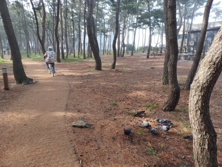솔밭길로 들어서니 어제 내린 비로 솔향이 더 짙게 풍기고 빽빽한 소나무가 햇살을 막아주어 시원했다. 혼자 신나서 걷고 있는데 반대쪽에서 나이 지긋하신 아저씨가 천천히 자전거를 타고 오셨다. 그러다 멈추시더니 갑자기 뭔가를 바닥에 뿌리셨다. 깜짝 놀라 멈춰 서있자니 비둘기들이 솔밭에서 모이를 주워 먹는 것이었다. 놀란 마음을 진정시키고 모이 먹는 비둘기 모습이 귀여워 사진도 찍어본다. 아마도 저 새들은 아저씨를 기억하겠지 싶다. 사진 속 모이를 한줌 뿌리고 유유하게 지나쳐가는 아저씨의 뒷모습이 도인같이 느껴지기도 한다.