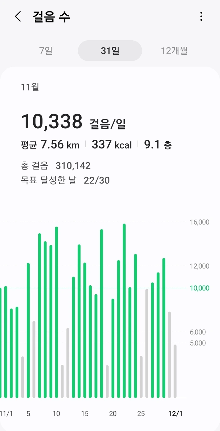 12월 1일을 얼마나 기다렸는지 모른다. 11월의 총걸음수를 확인해 보려고 말이다. 한 달 걸음수를 확인해 보니 11월 평균 걸음수가 10,338보가 나왔다. 평균 7.56km를 걷고 9.1층을 올랐다. 목표 달성한 날은 30일 중 22일로 달성률 73%이다.