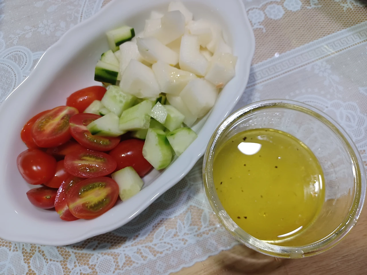 아침에는 이 지중해샐러드에 삶은 계란을 2개 곁들여 먹었고, 저녁에는 고등어 한 토막을 구워서 함께 먹었다. 푹푹 찌는 무더위에 입맛이 영 없었는데 새콤달콤한 샐러드가 입맛을 찾아주었다. 참외가 달아서 샐러드 소스를 많이 넣지 않아도 된다. 시판용 샐러드 소스에도 유화제라고 하는 안 좋은 성분이 들어 있다고 하니 샐러도 소스도 직접 집에 만들어 먹으면 좋다.