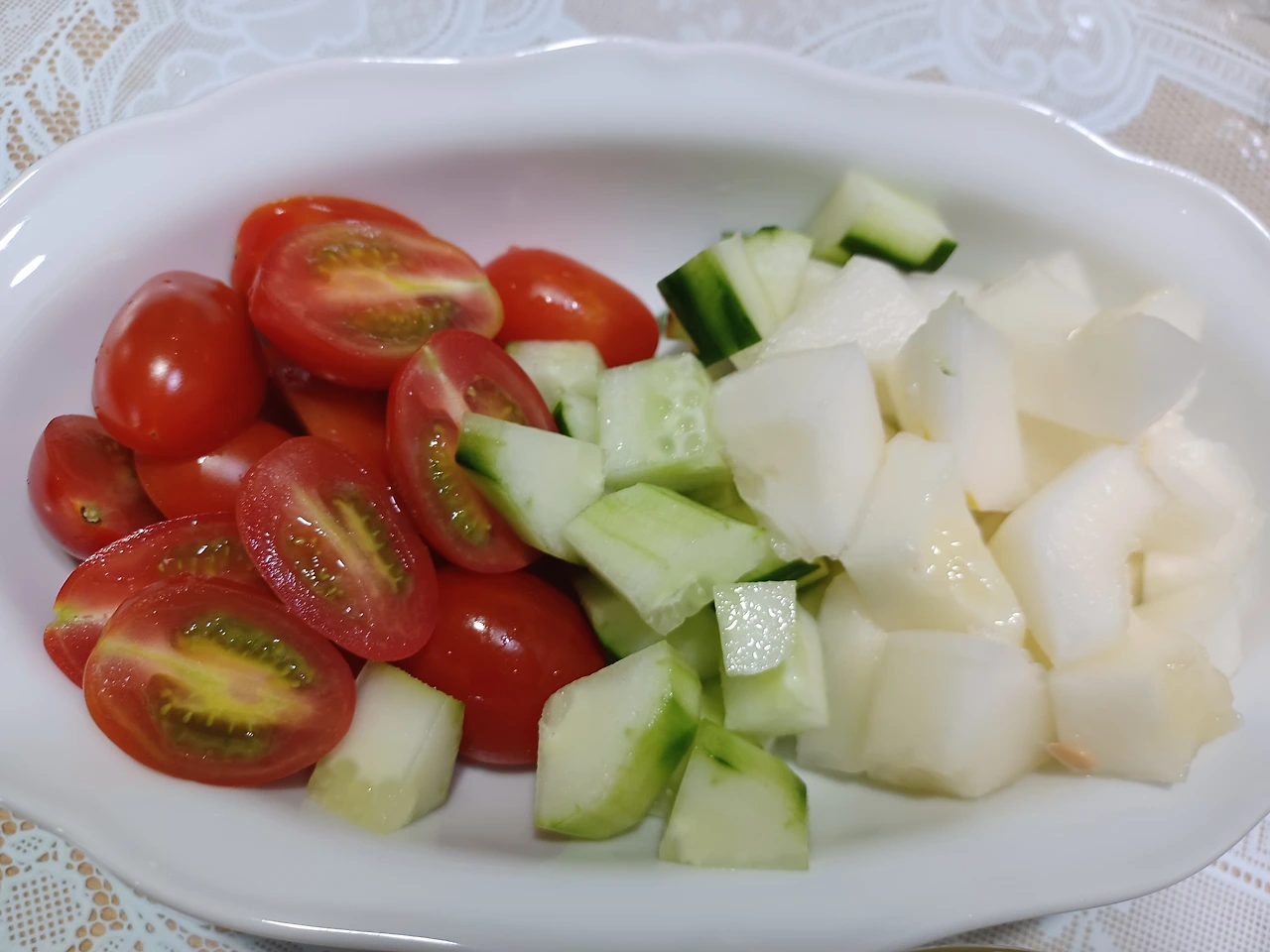 샐러드 만드는 방법은 정말 간단하다. 우선 방울토마토는 씻고 오이와 참외는 감자칼로 껍질을 벗겨 놓는다. 그다음 방울토마토는 반을 자르고 오이도 한입 크기로 자른다. 참외는 반으로 가른 다음 그것을 다시 4 등분해서 오이 크기로 작게 썰어놓는다. 참, 참외씨는 파내어 따로 모아 체에 받쳐 숟가락으로 꾹꾹 눌러 즙을 모아놔야 한다. 샐러드 소스에 넣기 위해서 말이다.