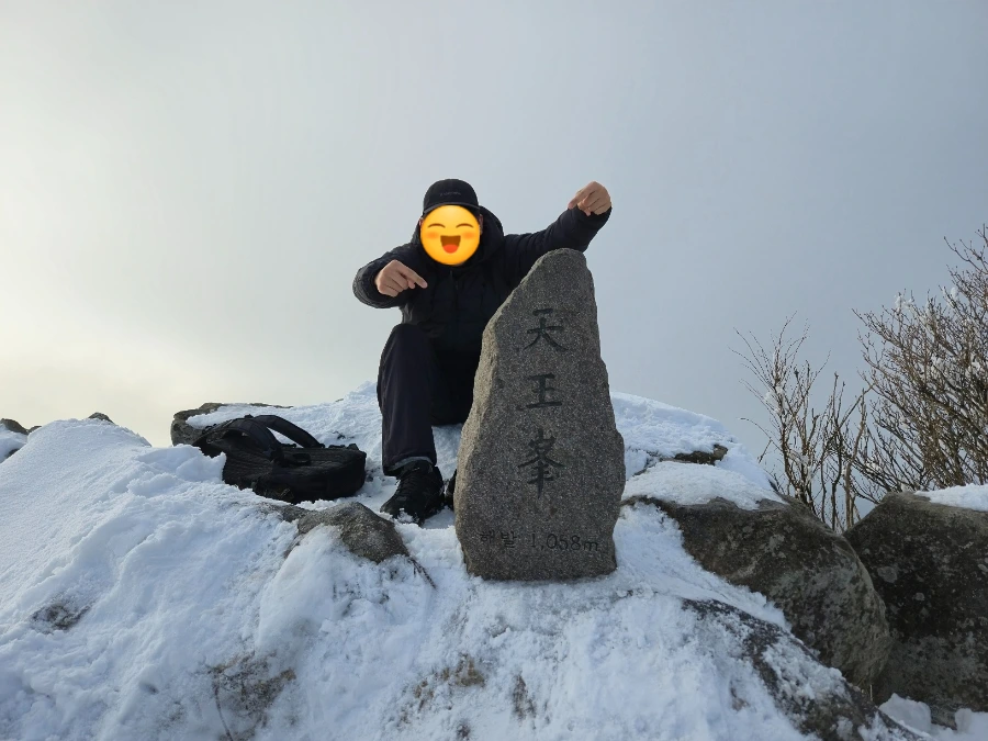 아이는 결국 정상을 찍고 내려왔다고 한다. 정상 부근에 눈이 와서 미끄러워서 오르느라 힘들었다고. 그래서 내려올 때 친구랑 미끄럼 타면서 내려와서 빨리 내려왔다고 한다. 어이가 없었다. 헛웃음만 나왔다. 이어서 가족톡방에 도착한 속리산 정상 인증샷.