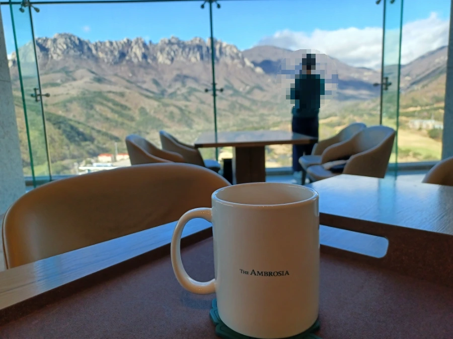커피는 마시지도 않고 테이크아웃잔에 담아달라고 부탁하고 창 너머 다시 울산바위를 바라본다. 더엠브로시아 바리스타는 매일 설악능선과 울산바위를 보면서 커피를 만들면 저절로 행복해지지 않을까? 혼자 생각해 본다.
