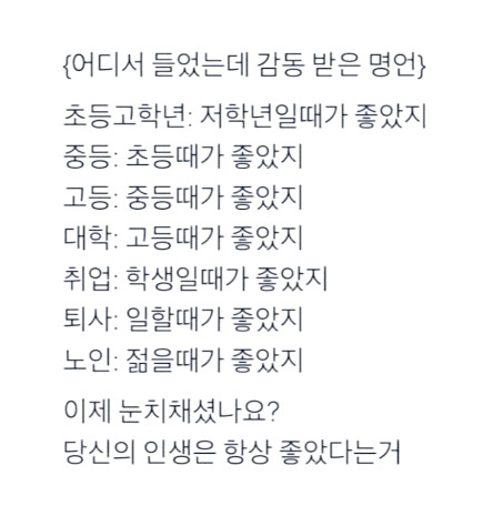 이 글 밑에 달린 댓글에는 이런 마음을 알기라도 하듯 환상을 깨버리는 댓글이 적혀있었다. '뭐야 갈수록 안 좋아진다는 뜻이잖아'. 초등학교 때보다 못한 중학교 때를 고등학생이 그리워하고 중학교 때보다 못한 고등학생 때을 대학생이 그리워하니 갈수록 안 좋아졌음에도 '과거미화를 하는 사람의 본성 때문에 그냥 좋았구나 하는 것'이라는 것이 댓글의 의도였다.