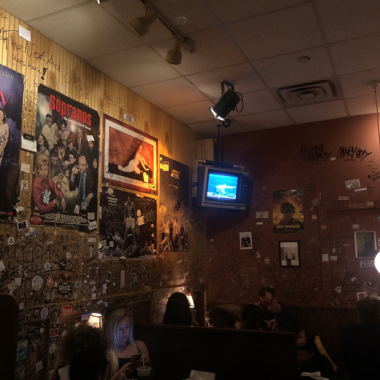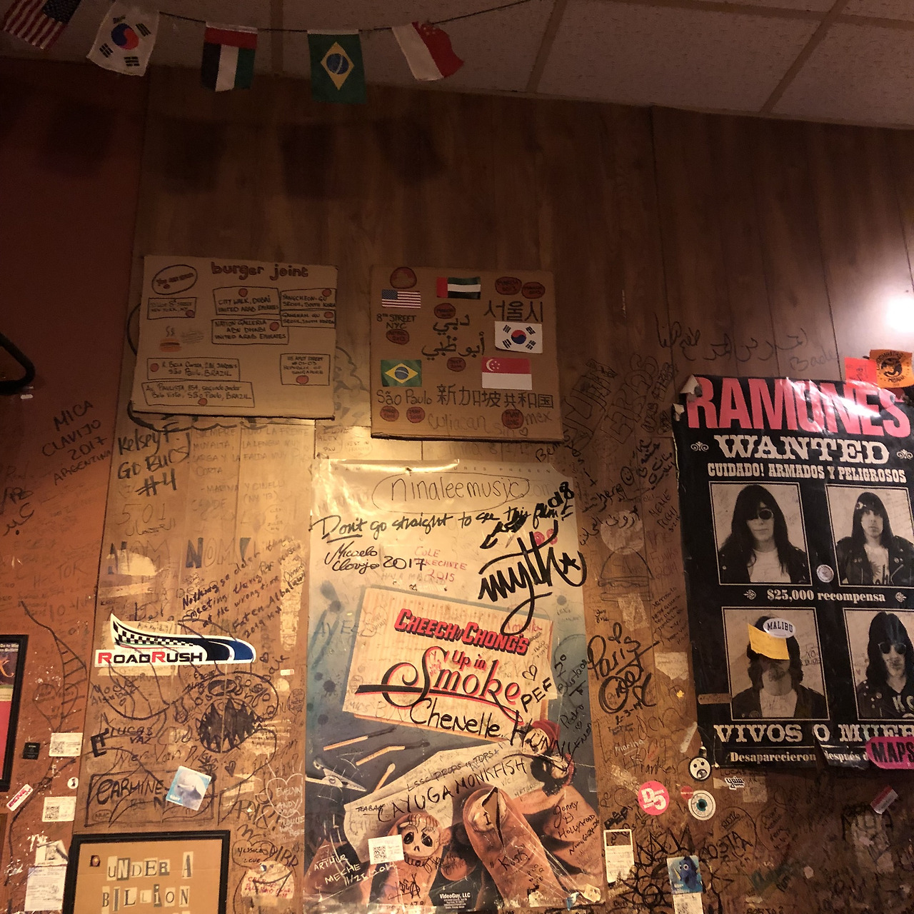 드디어 입구 안으로 들어왔다. 으레 호텔 안에 있는 버거집이라고 하면 으리으리한 넓은 공간에 고급스러운 사이니지와 식재료의 원산지부터 옵션까지 길게 쓰여 있는 스크린 메뉴판, 그리고 정갈하게 갖추어진 직원들의 유니폼과 우아한 음악과 깔끔하게 정돈된 테이블을 생각할 것이다. 하지만 틀렸다. 이곳 버거 조인트의 공간은 생각보다 작았다. 벽면에는 뮤지컬 포스터부터 오래된 영화와 잡지 포스터가 듬성듬성 끝쪽이 살짝 떼어진 채 너덜너덜하게 붙어있었고 여러 색상의 두꺼운 유성펜으로 쓰인 낙서들이 벽면을 가득 채웠다. 이곳을 다녀간 손님들이 한 낙서들이었다. 영어 외에도 드문 드문 다른 나라의 문자들도 눈에 띄었다. 하지만 지저분해 보이지 않고 되려 멋져 보였다. 얼마나 많은 사람들이, 다양한 사람들이 이곳을 다녀갔는지 상상하면서 먹기도 전에 햄버거 맛에 대한 완전한 신뢰를 갖게 되었다.