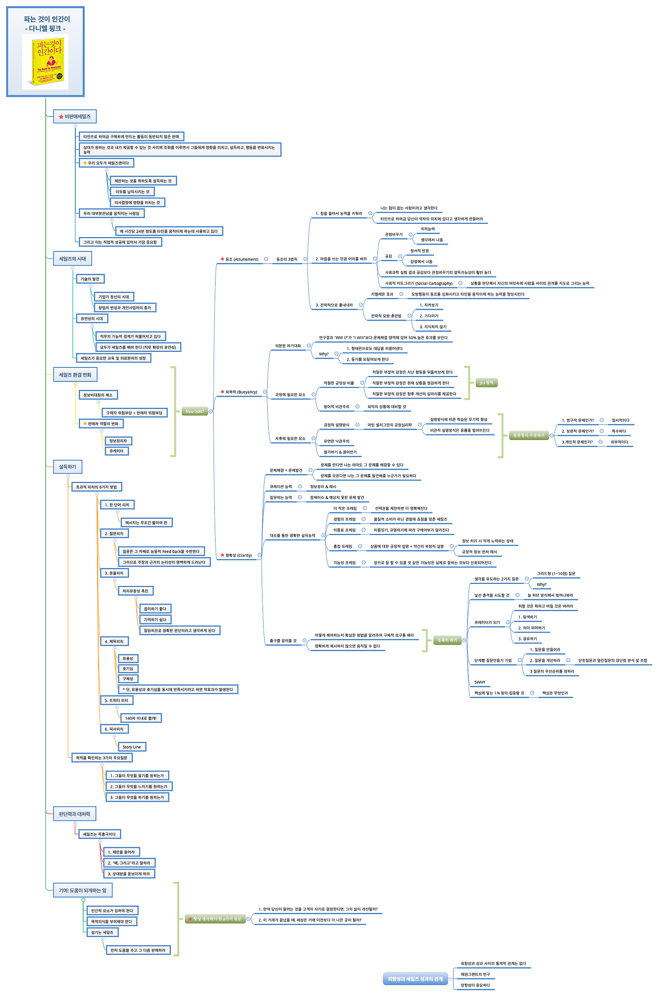 이 책에서 다니엘 핑크는 새로운 시대에서의 세일즈 전략을 New ABC 전략으로 명명하여 제시한다. ABC는 각각 Attunement(동조), Buoyancy(회복력), Clarity(명확성)의 앞 철자만 딴 것이다. 다니엘 핑크는 세일즈에 있어서 관점을 바꿔서 구매자에게 동조하고, 거래제안 빈도와 커버리지가 넓어진 만큼 늘어난 거절의 경험에 대한 회복력, 그리고 피칭과 설득의 명확성이 중요함을 역설한다. 그리고 각각의 내용들에 대한 방법론을 구체적으로 제시한다. (상세한 내용은 별첨파일인 '독서 마인드맵'과 이 책의 본문 텍스트를 참고하시라! 기회가 된다면 본문 내용 중 Remarkable 한 내용은 추후 포스팅에서 다루도록 하겠다.)