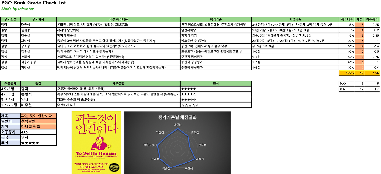 <파는 것이 인간이다>는 BGC 평가에서 4.65를 기록한 명저이다. 시중에 세일즈 관련 책은 정말 많다. 하지만 개인적으로 세일즈 카테고리 관련해서 좋은 책으로 여겨지는 책들은 거의 없었다. 그 이유는 크게 3가지이다.