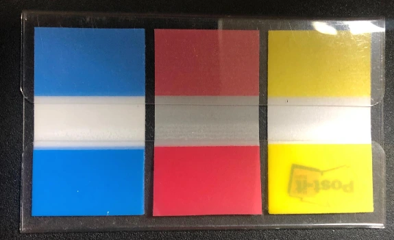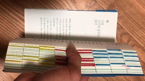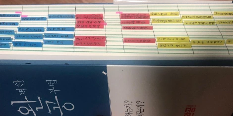 그렇게 하면 평균적으로 8~9개 정도의 여백이 나온다. 맨 위칸부터 3개 칸은 파란색 포스트잇을 붙일 구간이다. 그다음 3칸은 빨간색 포스트잇을 붙일 구간이다. 그리고 마지막 2~3개 칸은 노란색 포스트잇을 붙일 구간이다. 선을 그을 때 추천하는 방법은 위에서부터 3~4개 정도의 칸을 만들고 밑에서부터 다시 긋는 것이다. 그래야 중간 정도에 2.5cm가 아닌 여백이 생기는데, 향후에 이 부분을 잡고 책을 수월히 넘길 수 있게 된다. (그렇지 않으면 포스트잇이 여백 없이 덕지덕지 붙게되어 책장을 넘기기가 불편해진다.)