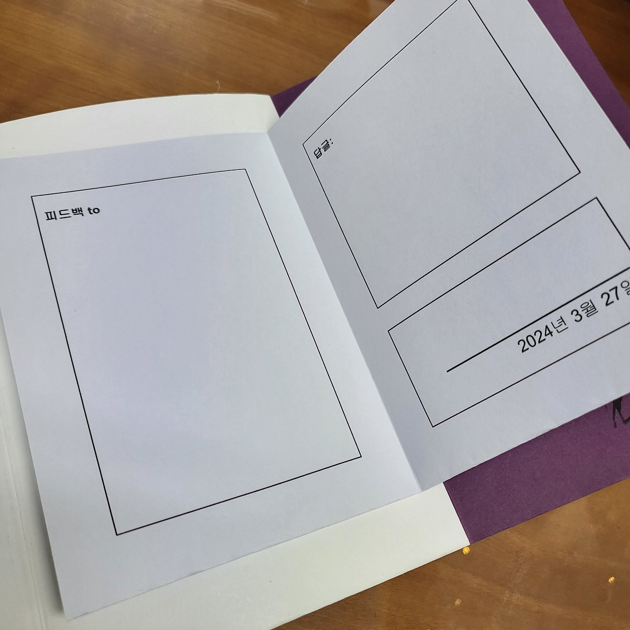 1차 목차 과제를 수행한 용지 뒷 면에 피드백 양식을 간단히 만들었다. 이렇게 접어 책 표지에 붙여주면 잃어버릴 염려도 없고 처음부터 어떻게 이 부교재 활동을 했는지 그 흐름이 이어지니 서로 연결해 가며 더 많이 사고하는 계기가 될 것이다.