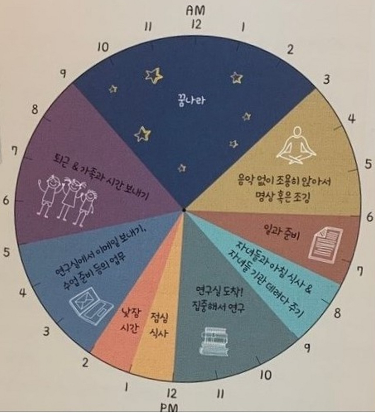 이러한 일과가 가능한 것은 낮 시간 동안 선택한 일에 대한 집중으로 효율적인 루틴을 만들어 두었기 때문일 것이다. 9시 취침, 3시 기상이 편한 가보다. 내 루틴을 돌아본다.