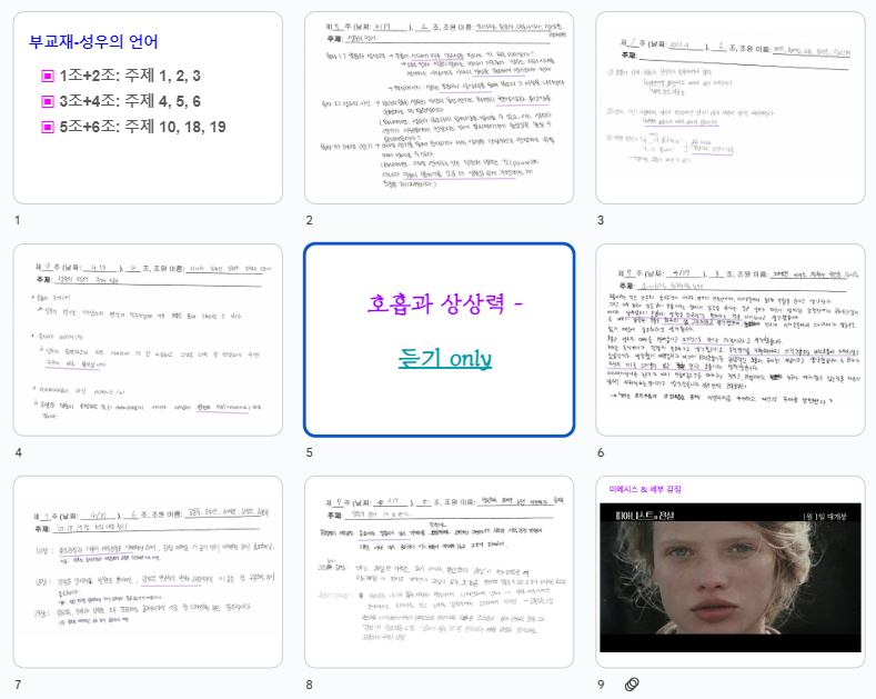 읽기는 꾸준히 이어지고 있어서 호흡, 상상, 여백, 미메시스, 감성과 관련한 부분은 여러 번 정독하게 되었다. 생각들이 상상을 더해 머릿속을 불분명하게 헤매고 있을 때 그룹 논의를 하게 된다. 다른 사람들의 해석과 상상의 도움으로 자기 자신의 사고 지평을 넓힐 수 있는 좋은 시간이다.
