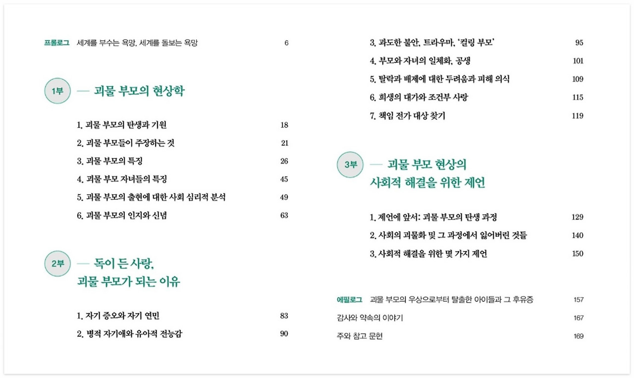 학벌 만능 주의 등의 다양한 사회적 현상들, 교육에 대한 서비스로의 인식 변화, 학부모의 고학력화 및 학교에 대한 불신 등 다각적으로 어떻게 괴물 부모가 탄생하고 사회를 망가뜨리는지 분석합니다.